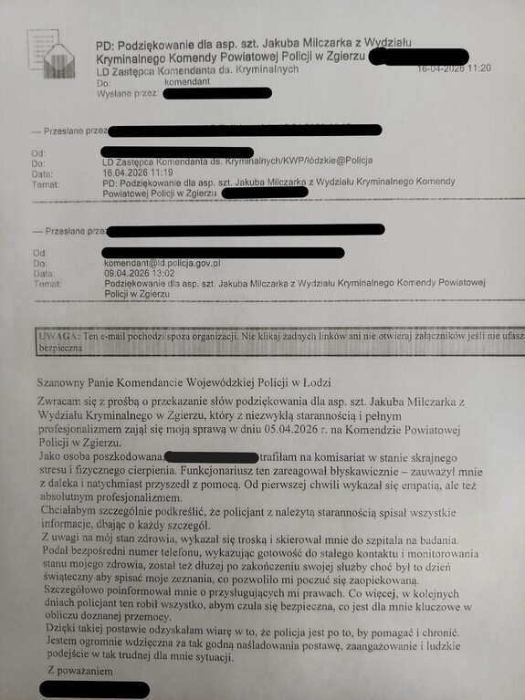 Na ręce Komendanta Powiatowego Policji w Zgierzu przekazane zostały podziękowania dla policjanta naszej jednostki. Funkcjonariusz dzięki swojemu profesjonalizmowi i okazanej empatii sprawił, że trudna sytuacja życiowa, w jakiej znalazła się potrzebująca pomocy kobieta, została rozwiązana.