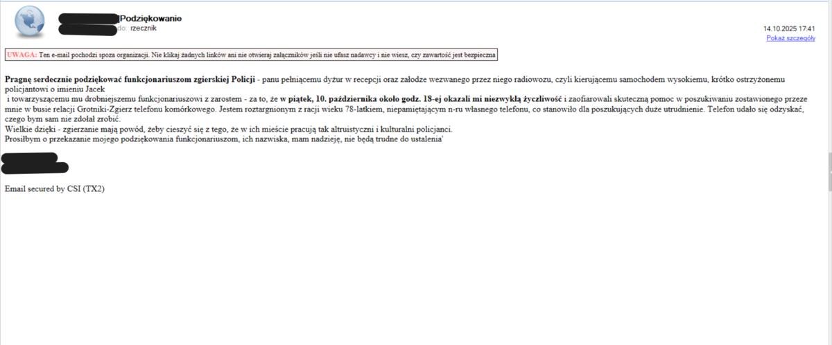 10 października 2025 roku do KPP w Zgierzu przyszedł 78-letni mieszkaniec Łodzi i poinformował policjantów, że zagubił swój telefon. Podejrzewał, że „komórkę”, mógł zostawić w busie relacji Grotniki-Zgierz, gdyż wracał nim ze swojej działki. Sprawę dodatkowo komplikował fakt, iż mężczyzna nie znał swojego numeru. Policjanci postanowili działać i wraz z 78-latkiem pojechali do lokalnego zgierskiego przewoźnika, aby ustalić w którym busie mogło dojść do zagubienia. Niestety trop ten prowadził do nikąd, gdyż jak się okazało zgierska firma, nie obsługuje trasy jaką podróżował mężczyzna. Policjanci dowiedzieli się od roztargnionego seniora, że od czasu do czasu grywa on na fortepianie w jednym z łódzkich lokali. Funkcjonariusze odnaleźli w internecie dane kontaktowe tego miejsca i od właściciela dostali numer zagubionego telefonu 78-latka. Kiedy zadzwonili, po drugiej stronie odezwał się kierowca busa, który odnalazł „komórkę”. Wskazał on policjantom miejsce gdzie zguba będzie czekać na właściciela. Nie pozostało już nic innego jak tylko pojechać i odebrać telefon. Policjanci wykonując swoje codzienne obowiązki kierują się hasłem „pomagamy i chronimy”, niemniej jednak cieszą miłe słowa, w których docenia się ich ciężką pracę.