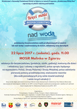 - JUŻ W SOBOTĘ! ZAPRASZAMY NA PIKNIK "KRĘCI MNIE BEZPIECZEŃSTWO NAD WODĄ" Dzielnicowi Komendy Powiatowej Policji w Zgierzu serdecznie zapraszają całe rodziny na otwarty piknik "Kręci mnie bezpieczeństwo nad wodą", który odbędzie się 22 lipca 2017r. (sobota) od godz. 11.00 na obiekcie MOSiR Malinka Zgierz. W programie m.in. edukacja dla bezpieczeństwa , konkursy dla dzieci i młodzieży z atrakcyjnymi nagrodami, pokazy sprzętu Policji, Straży Pożarnej i Straży Miejskiej, pokaz udzielania pierwszej pomocy, znakowanie rowerów, i wiele innych atrakcji. SERDECZNIE ZAPRASZAMY