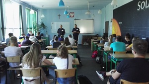 Aleksandrowscy policjanci wraz z funkcjonariuszami z KPP z Zespołu Nieletnich i Patologii rozmawiali z młodymi ludźmi o karnych skutkach zażywania środków odurzających i cyberprzemocy.